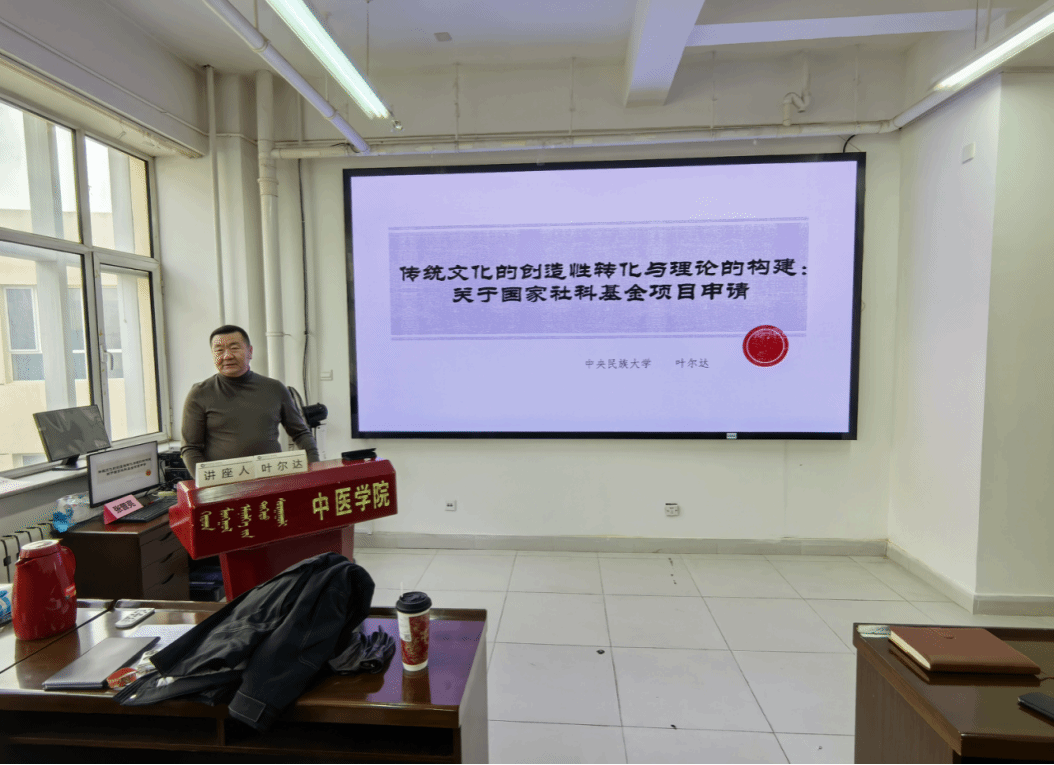 为进一步提升学院教师的科研能力,推动国家社科基金项目申报工作高效开展,2024年12月10日,学院召开国家社科基金项目申报推进会。会议邀请中央民族大学叶尔达教授为师生作题为《传统文化的创造性转化与理论的构建:关于国家社科基金项目申请》的学术讲座。会议由学院院长包哈申教授主持,蒙医药学院、民族医药创新中心、中医学院、人文学院、卫生管理学院、马克思主义学院、护理学院、图书馆等部门的50余名社科领域老师和学者参会。