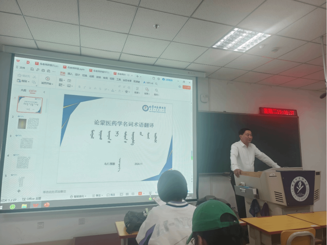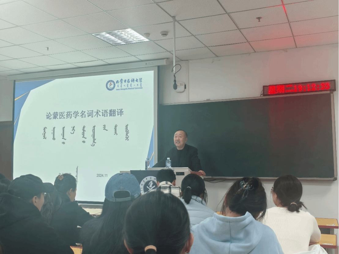 讲座由学院副院长孟根杜希主持。杜院长首先为学生们阐述了蒙医药专业术语翻译规范的重要性,并强调了此次讲座的必要性。