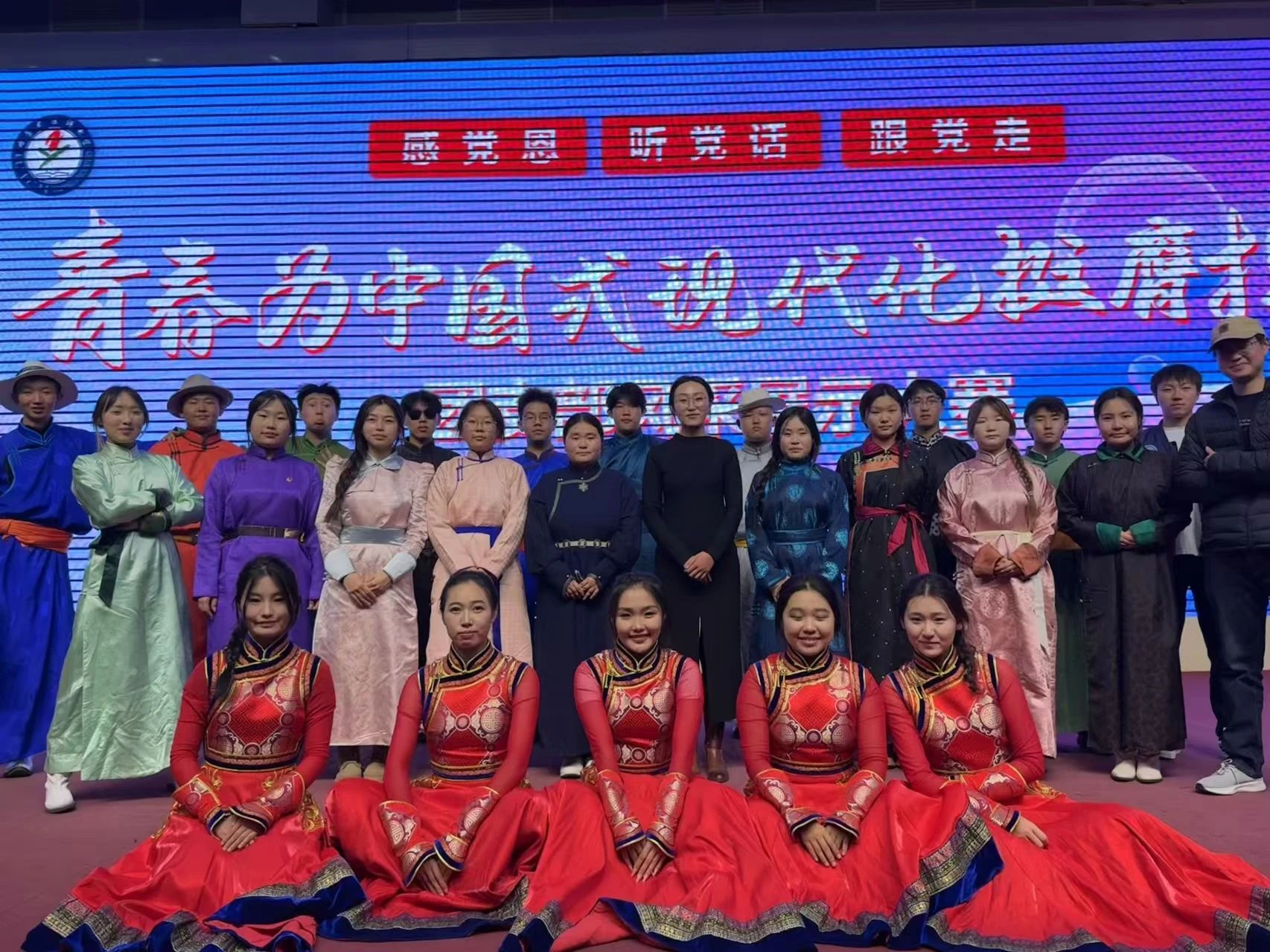我院团支部表演的主题团日活动《乌兰牧骑》独具民族特色,马头琴悠扬的旋律奏响,舞蹈演员们身着传统服饰,舞步轻盈且充满活力,饱含着青春的热情和对祖国的热爱,展现出以铸牢中华民族共同体意识为主线的青年中国式现代化挺膺担当精神。