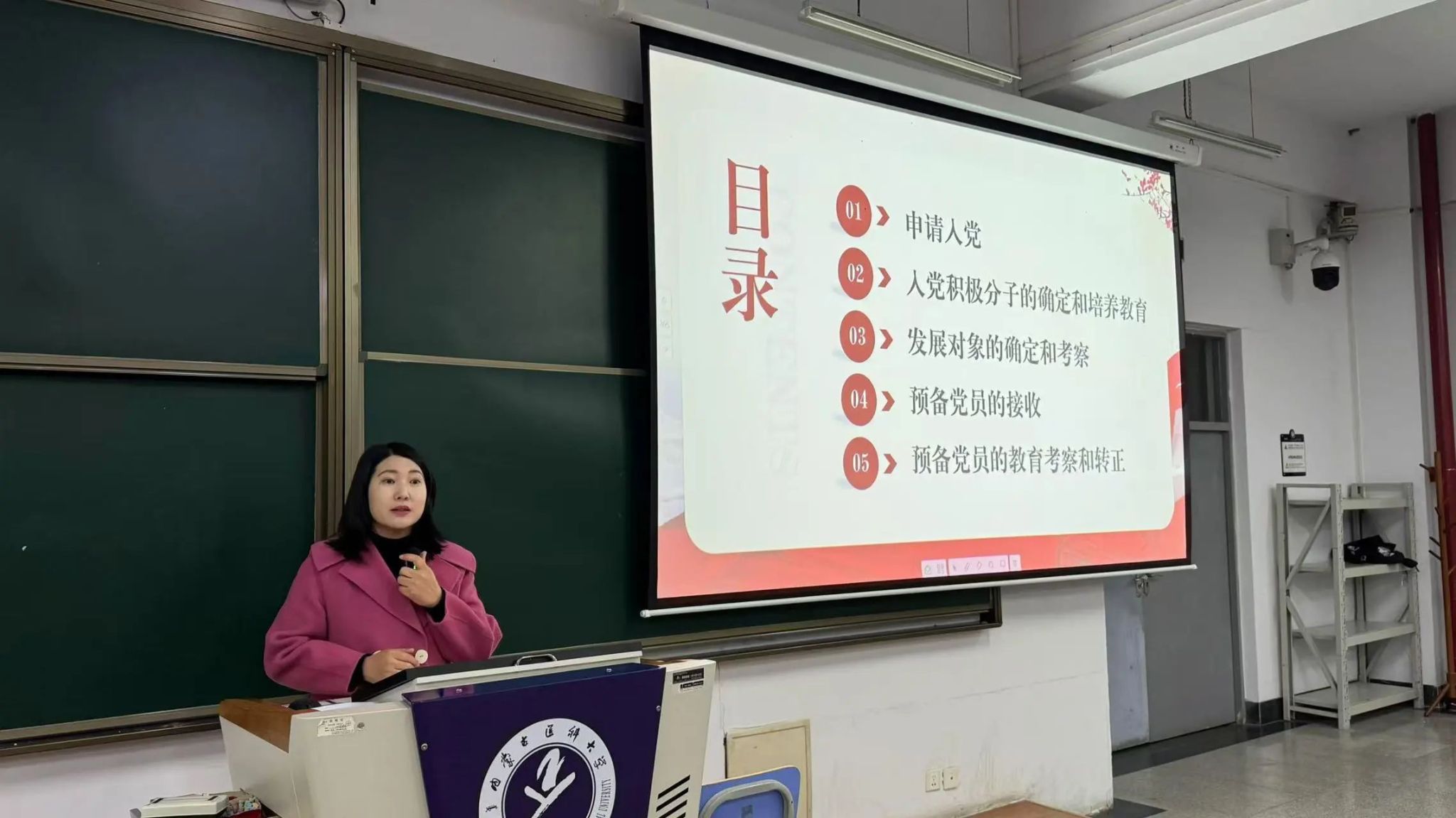 首先由白图雅老师以入党流程为主线详细的介绍了党务知识。白图雅老师强调申请入党时,个人需展现出对党的忠诚和对社会主义事业的坚定信念。在入党积极分子培养教育阶段,通过学习党的基本理论、基本路线和基本方略,积极分子应逐步树立正确的世界观、人生观和价值观。发展对象的确定和考察阶段,重点考察其政治立场、道德品质和工作表现,确保其符合党员标准。预备党员的接收和转正阶段,则要求预备党员在实践中不断加强党性修养,积极履行党员义务,为党的事业作出贡献。