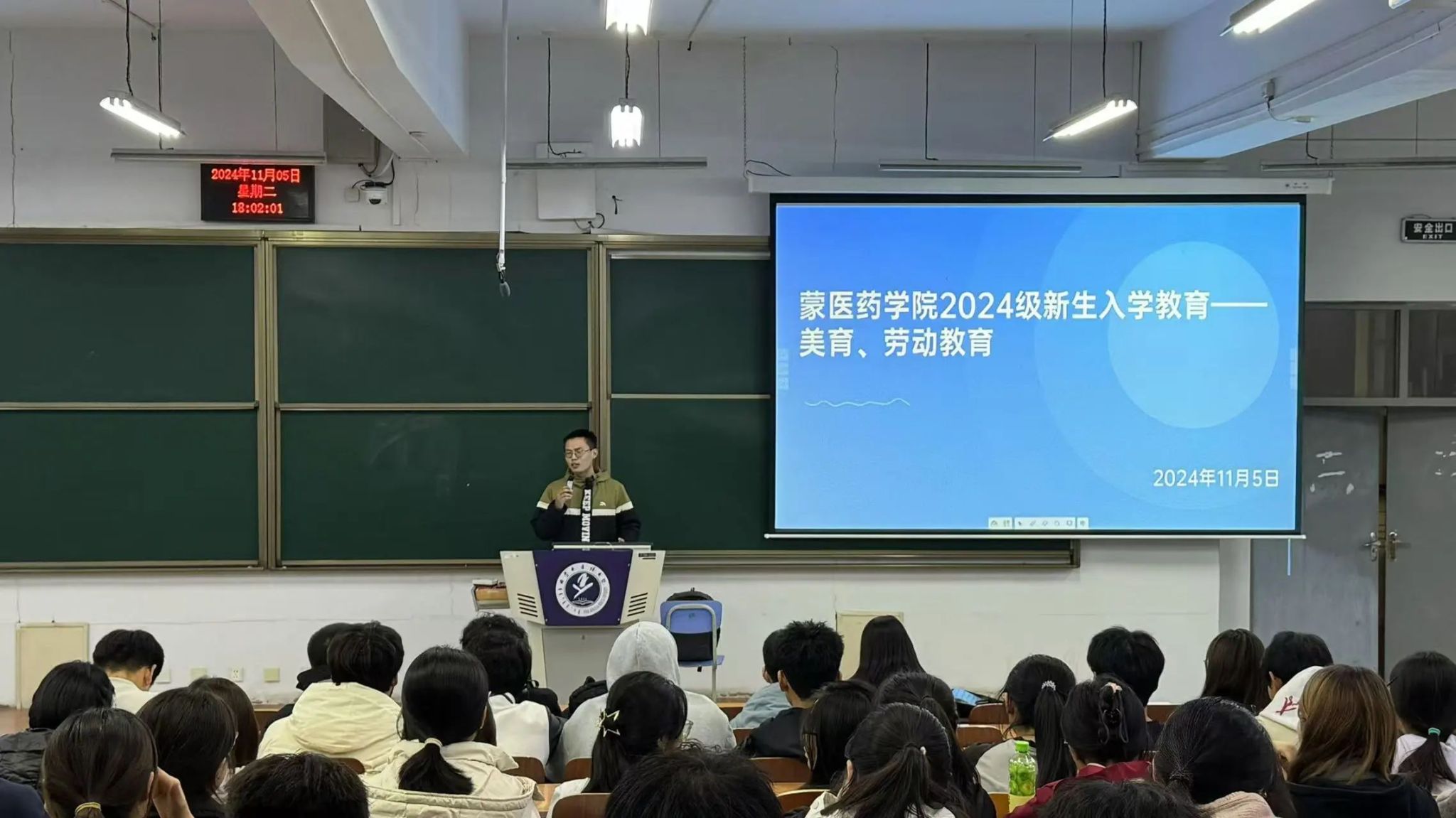 11月5日,我院在问学堂101教室面向2024级学生开展了“入党流程及党务知识”和“美育、劳育”主题入学教育,分别由学生工作办公室副主任白图雅和辅导员新特力讲授。