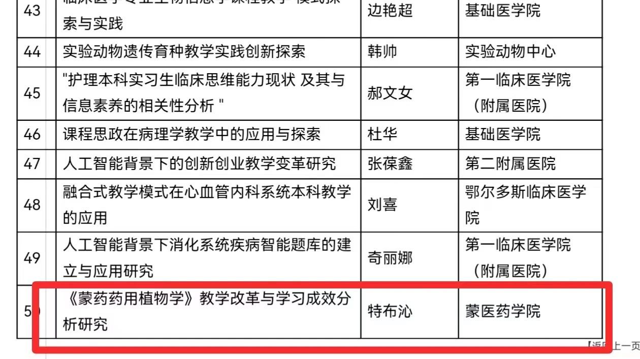 我院特布沁老师关于 2024 年度校级本科教育教学改革研究与实践项目——《蒙药药用植物学》教学改革与学习成效分析研究成功获批立项。