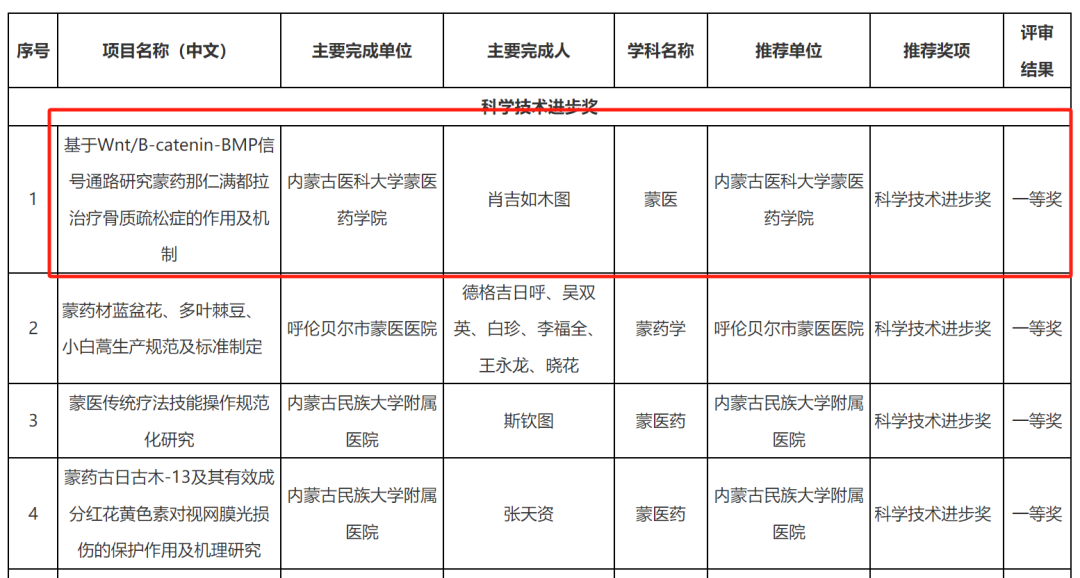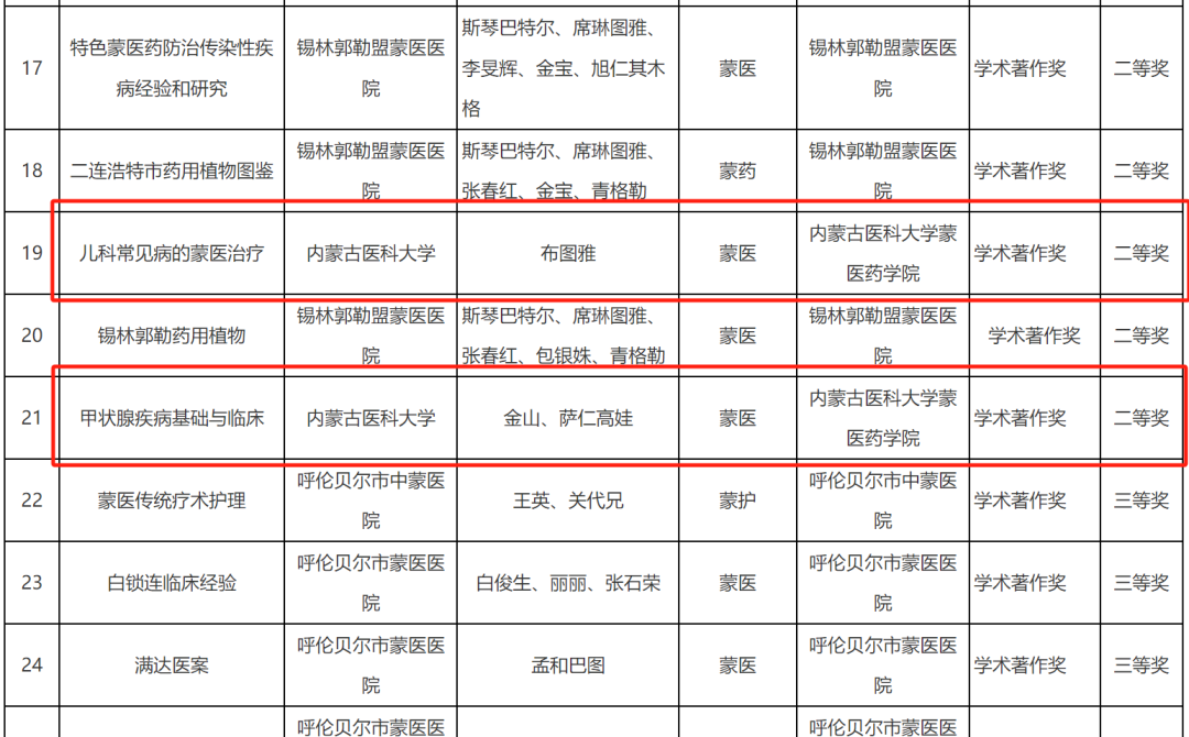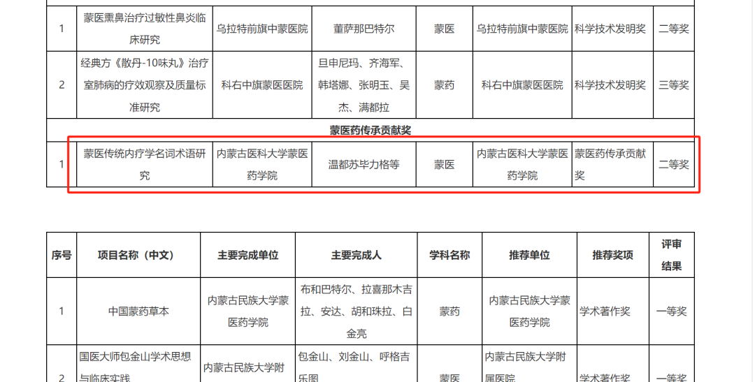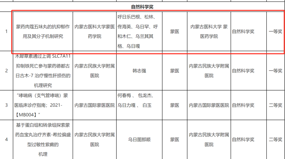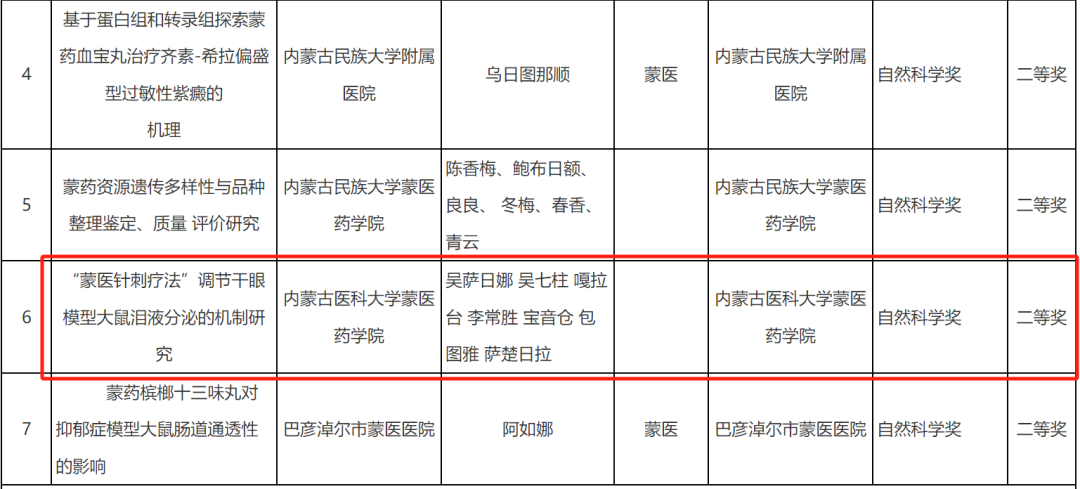 呼日乐巴根、松林、佟海英、乌日罕、呼和木仁、乌兰其其格、乌日嘎获得 2024年度内蒙古自治区蒙医药学会自然科学奖一等奖。吴萨日娜 吴七柱 嘎拉台 李常胜 宝音仓 包图雅 萨楚日拉获得 2024年度内蒙古自治区蒙医药学会自然科学奖二等奖。