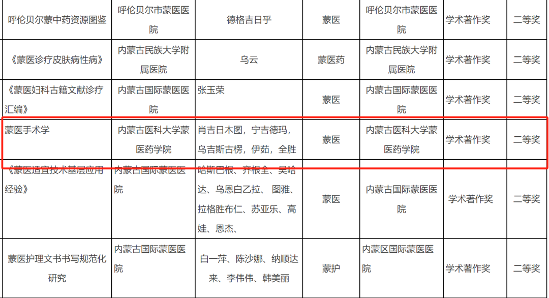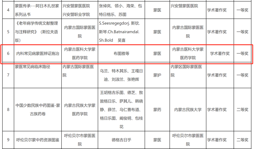 布图雅等获得2024年度内蒙古自治区蒙医药学会学术著作奖一等奖。肖吉日木图,宁吉德玛,乌吉斯古楞,伊茹,全胜获得2024年度内蒙古自治区蒙医药学会学术著作奖二等奖。布图雅获得2024年度内蒙古自治区蒙医药学会学术著作奖二等奖。金山、萨仁高娃获得2024年度内蒙古自治区蒙医药学会学术著作奖二等奖。