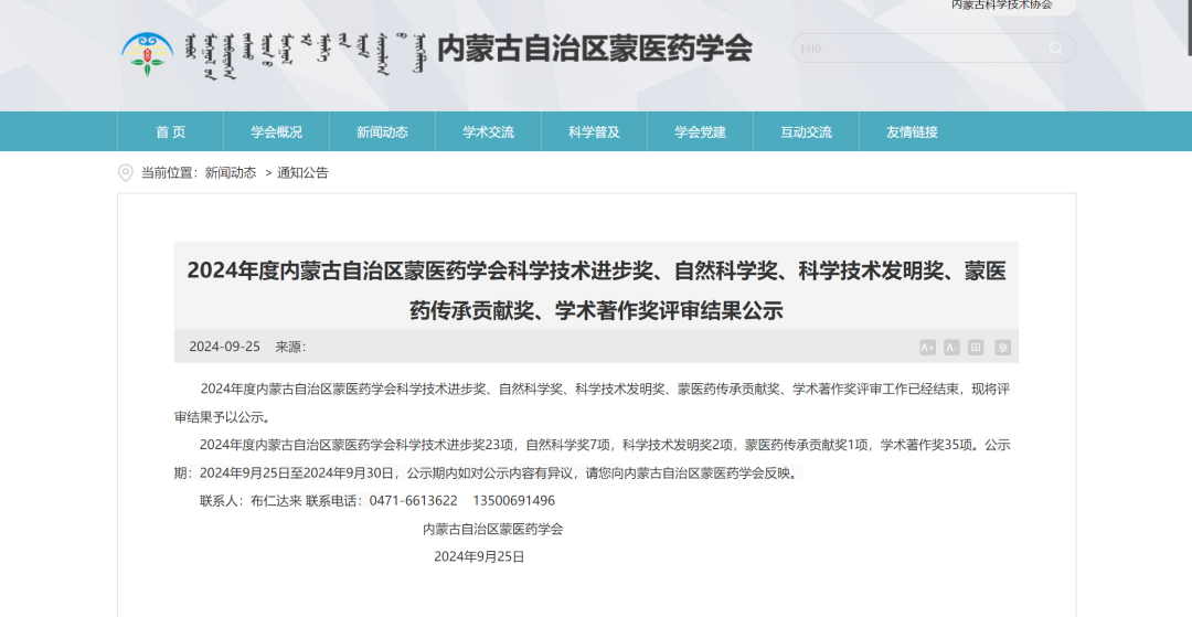 9月25日,内蒙古自治区蒙医药学会公示了2024年度内蒙古自治区蒙医药学会科学技术进步奖、自然科学奖、科学技术发明奖、蒙医药传承贡献奖、学术著作奖评审结果,我院多名教师获奖。